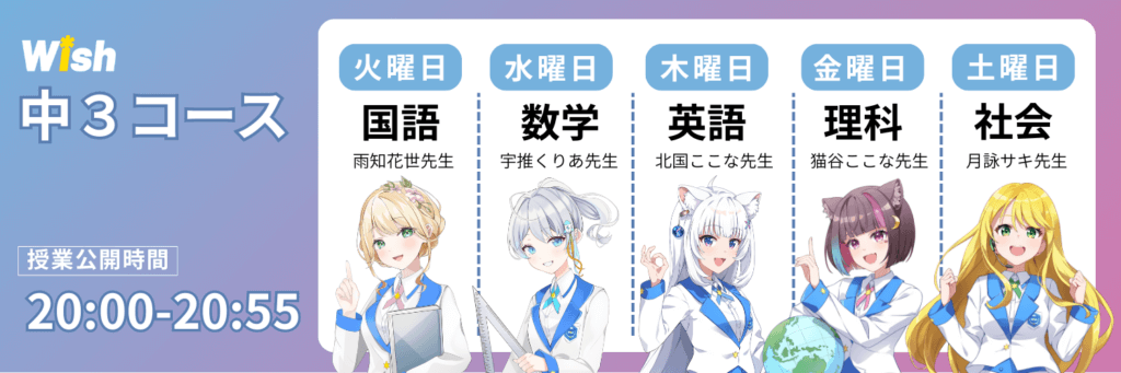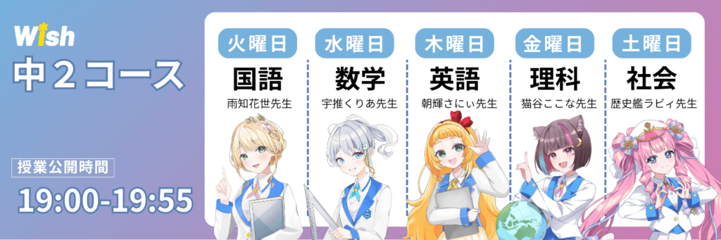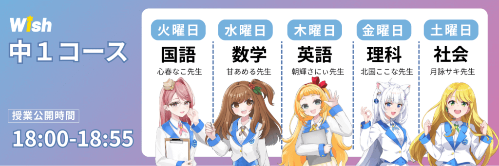 体験授業 TRIAL 新しい形のオンライン学習塾であるWish!VTuber先生がどんな授業をするのか、実際に体験してみましょう。 上記の動画は、【宇推くりあ先生】の中3数学授業です。Wishの先生たちは、普段から学術的な配信をしていたり、それぞれに専門分野があったり、国公立大学や大学院などで学んでいたり。さらに、普段配信をされているのでお話がとても上手く、勉強を楽しく教えることができます! 他教科のオンライン授業も特別に公開! 心春なこ先生・中1国語 甘あめる先生・中1数学 雨知花世先生・中3国語 北国ここな先生・中1理科 宇推くりあ先生・中2数学 朝輝さにぃ先生・中2英語 入会月の受講料0円!ご入会はこちらから 毎日のYouTubeタイムを活用するだけ 現在、YouTubeなどの動画コンテンツを見る時間が長い子どもが多いと言われています。いつもYoutubeを観ている時間のうち、毎日”1時間”だけVTuber講師の動画配信を観る時間に置き換えてみませんか?VTuber先生に質問を送ると、あなたの質問が授業中に読まれる可能性もあります!そんな一方通行ではない授業が、あなたのモチベーションを引き出してくれます。 楽しいから始めて、飽きずに続けられる!気付いたら勉強が出来るようになっている! そんな、他ではないオンライン学習塾がWishです。 授業スケジュール SCHEDULE 全コース、中学で学習する5教科(国語・数学・英語・理科・社会)を受講できます。 火曜日~土曜日に授業が配信され、リアルタイムで受講できない場合はアーカイブで学ぶことが可能です。アーカイブは1年間残るので、いつでも見直すことができます。 また、VTuber先生から宿題が出されます。ICT教材で何度も復習することにより、理解度と定着率を上げることが可能です。 週5回×4週間/月の配信です。 5週目の動画配信はございません。 授業時間になると「受講生ページ」から授業動画を視聴できます。 入会後の流れ FLOW 新しい形のオンライン学習塾、Wishを受講する流れは下記の通りです。 STEP 1 ご希望の受講コースを選んで決済 この体験授業ページの下部にある「コース紹介」からご料金や内容をご覧いただき、希望のコースの「受講登録」ボタンを押します。 クレジットカード決済の画面が開きますので、必要箇所に入力いただきますと入会登録は完了です。 STEP 2 ID発行 クレジットカード決済が完了してから3営業日以内に、Wishから案内メールが届きます。 案内メールには、受講生ページと教材システムのIDとパスワードが記載されています。 あなただけのIDとなりますので、忘れないように保管してください。※Wishは火曜~土曜を営業日としております。 STEP 3 受講生ページ説明 最初にお送りする案内メール内に、受講生ページのURLを記載しております。 また、当HP内の「受講生ページ」ボタンからもログインできます。 受講生ページが、授業を受けたり、アーカイブで復習したり、VTuber先生への質問を送ったりする、Wishのオンライン教室です。 STEP 4 受講コースの授業で本格オンライン学習 オンライン学習塾、Wishで学習を開始しましょう!公開時間に授業を受けたり、アーカイブで復習をしたり。VTuber先生の授業を何度も受けて、楽しく学んでいきましょう! 楽しく学べるコンテンツが充実 CONTENTS スケジュールが合わなくてもアーカイブ視聴で勉強できるから、部活や仕事で忙しい人も受講できます!その他にも、楽しく学習を継続できるオンラインコンテンツが充実しているのがWishの他にはない魅力です! POINT 1 宿題について VTuber先生から教えてもらった内容を「定着」させるために、Wishでは宿題を出しています。 教材システムのMy eトレを使用し、何度も繰り返し解くことで成績アップにつながります。 自主的に問題演習を多くした受講生の中から、毎月3名に「VTuber先生からのご褒美メッセージ」をお送りします♪ POINT 2 アーカイブ復習 Wishは、アーカイブで何度でも復習ができるオンライン学習塾です。 VTuber先生の授業を流しながら宿題を解くと理解しやすくなります。 また、通勤・通学中にアーカイブ視聴して復習すると効率的です。 授業スケジュールが部活や習い事・仕事で合わなくても、アーカイブで視聴し、分からないところは「質問BOX」に送って、一緒に勉強していきましょう! アーカイブは1年間残るので、いつでも見直すことができます。 POINT 3 質問BOXで交流 授業や宿題で分からないところがあったら、受講生ページ内の「質問BOX」から送ることができます。 あなたの質問が、VTuber先生の授業で取り上げられるかもしれません。 POINT 4 カウンセリングルーム Wishでは、バーチャルカウンセラーである心春なこ先生の個別カウンセリングルームを設けています。1対1でカウンセリングを受けることが可能です。 心と体の健康は勉強をする上でとても大切です。 VTuber講師が成績アップを応援! MESSAGE Wish公式スタッフVTuberのちあ ももこです!学問の楽しさを知っているWishのVTuber先生たちは、みなさんに興味を持ってもらえるよう工夫を