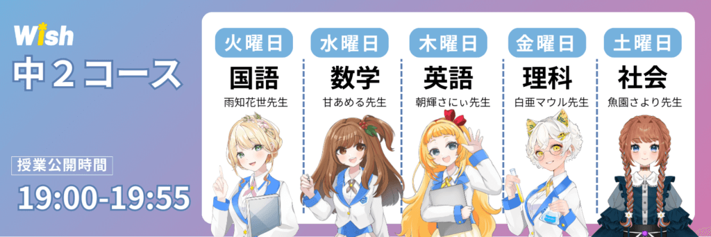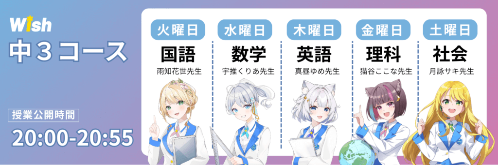 Wishは、アーカイブで何度でも復習ができるオンライン学習塾です。 VTuber先生の授業を流しながら宿題を解くと理解しやすくなります。